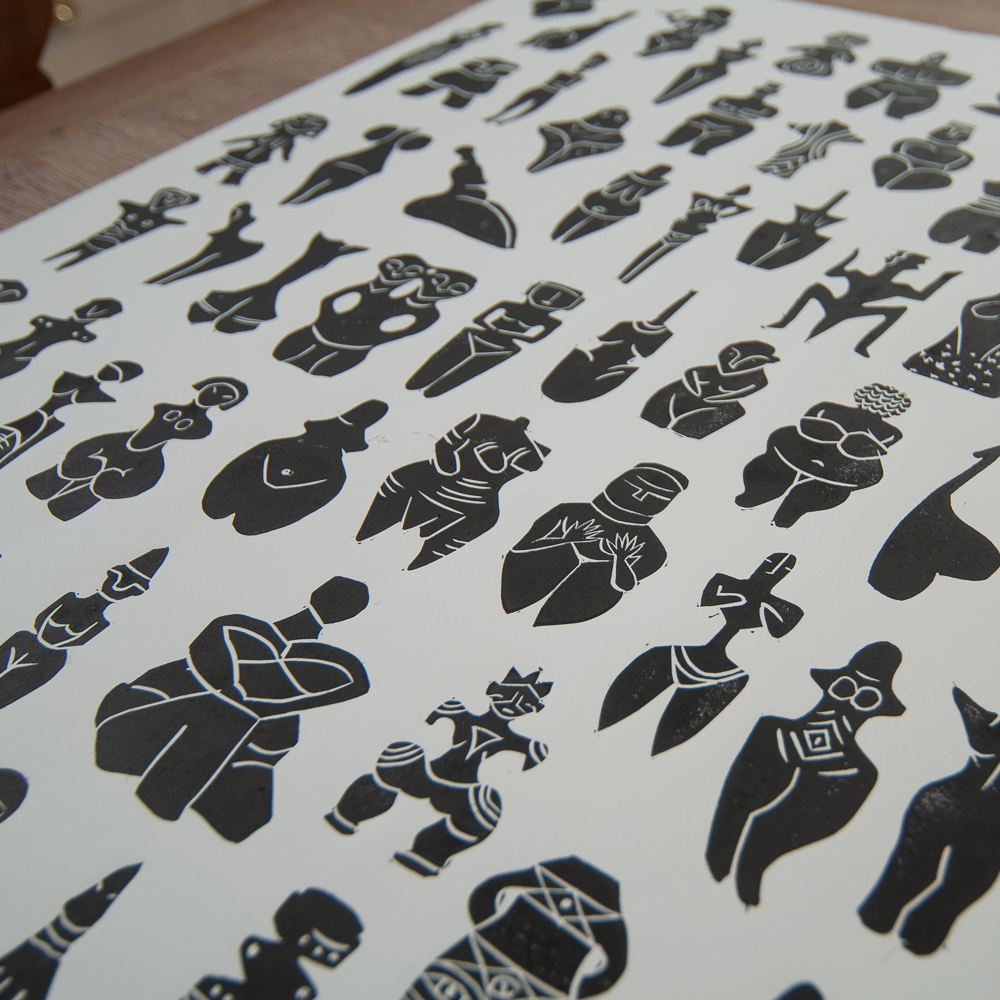 I spent 100 days researching and carving prehistoric goddess from around the world. The final print is now available to buy! 10 % of all sales of this print will go to the End Violence Against Women Coalition.